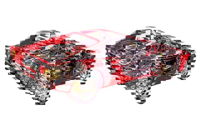 The body was made from lightweight glassfibre and Kevlar, and was overseen by F1's Dr Harvey Postlethwaite. Its revised chassis had a 4-inch wheelbase stretch over the 308's, and that was done to accommodate longitudinal mounting of the 400bhp twin-turbocharged 2.9-litre engine.