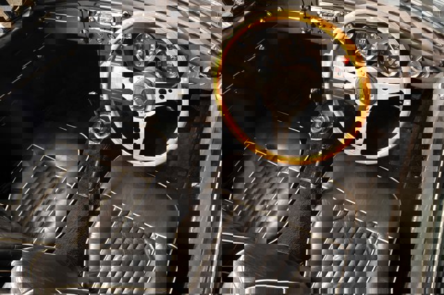 Late model MGB GT interior shows a no-nonsense approach... the stripy seats were very much of their time